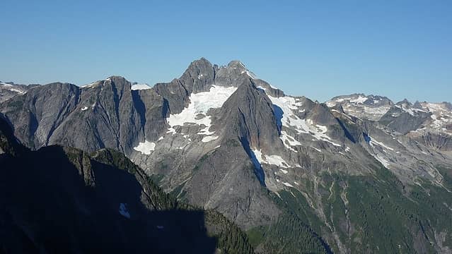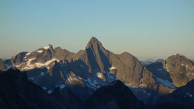 We then made an ascending traverse southwest towards the south ridge, and below a wicked tower dropping down from the slightly lower northern summit of the east peak. I recall this feature looking like the big cliff in Gondor from the LOTR movies. We then crossed a large snow bridge over a bergschrund and regained talus at about 8,000 feet below the steeper, final snowfield that led to the summit. The final 280 feet on the south ridge was on scarily loose huge boulders that seemed waiting to roll over onto our leg at any point, and weaving through various towers and rock pillars. We finally reached the summit of East Fury around 7pm and I was beginning to doubt the rumors of a camp on the summit. There was no clear flat spots and nothing indicating anyone had camped anywhere. I then noticed the steep snowfield and saw where the top of it was flat and realized that was probably the camp. Not wanting to camp on snow though, we spotted a large flat rock about 20 feet below the highest point and managed to fix it up enough to make a great tent pad. The hardest part was pushing a large boulder off the flat spot, and filling in a few cracks, but we got the tent up and we both had a comfortable place to sleep!! The sunset as we cooked dinner was superb with all the pickets visible, and the glow behind Shuksan and Baker. The traverse to West Fury was in plain sight right from the tent. We left the rain fly off that night and I was able to catch some meteors dancing across the sky before drifting off into another great night of sleep.
