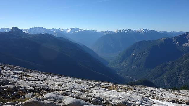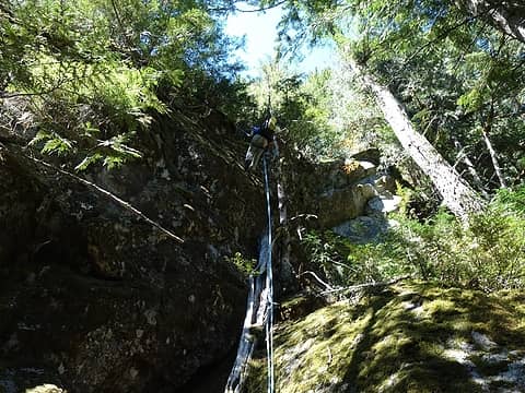 Day 7 Since we were in a more west facing basin the sun didn't hit us early. I ate the rest of the oatmeal either of us had and Etai passed on breakfast. I couldn't stop complaining how hungry I was the entire last couple days and just wanted to get out so I could eat! We traversed over somewhat unstable talus across Crescent Creek Basin to the Chopping Block Ridge camp in the shade and upon reaching the ridge, I took a good look below and informed Etai we would save so much distance if we simply descended the Crescent Creek approach. Reading Stephs comments about it though made us cringe. We were going to be in for some harrowing bushwhacking... So we started down stump hollow which was a heavenly area of beautiful slabs and small streams. We pretty quickly reached treeline though and found a decent trail we were able to stay on most of the way down the ridge. This ridge is actually the lower part of the barrier and lines the west edge of Terror Basin. When we reached 3,800 feet, we spotted a piece of flag tape and figured this was the spot to begin descending east down the steep 1,800 foot slope to Terror Creek. At first it wasn't so bad but we never found any semblance of a trail and continued straight down, schwacking our way down 50 degree slopes utilizing veggie belays copiously! Just as Steph described though, we ran into many cliff bands in the forest. We were able to bypass the first 3 by traversing to skiers right but we then hit one very large one that due to laziness we just decided to rappel off trees to get down. Two full rappels got us down to a slide alder patch that ended up taking a monumental act of congress to pass through. Once beyond that, we reached Terror Creek 40 minutes later and rinsed ourselves off. We were covered in dirt, sweat an pine needles! We found a log to cross Terror Creek on and the trail we thought would be an easy walk, ended up being a half-mile of hell bushwhacking along Goodell Creek. Apparently the good trail doesn't go much beyond the turnoff for the trail up Terror Basin (which I had been up before). There were some flagging but the trail was so non-existent it wasn't any help. We were forced to climb over huge, moss covered boulders, logs and downed trees. Sometimes the moss was hiding death holes you would sink into as well. This part of the descent was the worst because it was flat, and even uphill at times. Eventually the trail improved after enough swearing from Etai haha. We finally reached the old logging road and the remainder of the hike to Highway 20 was uneventful, albeit a painful 5 miles. Upon reaching the highway, we began hitchhiking, and after only 10 minutes an older guy who has been working for Seattle City Light in Newhalem for years picked us up and took us to Marblemount. Amazingly he knew John Roper quite well, as well as John's father, who used to be his supervisor there in Newhalem!