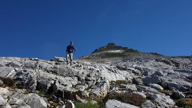 Day 6 When the alarm went off I wasn't interested in moving before twilight so we snoozed (people who have climbed with me know I hate alpine starts!). When it was light enough to see we quickly ate some snacks and skipped cooking the oatmeal. By sunrise we started moving. We rappelled down from a large boulder towards the snow below, then traversed a ledge to skiers left and made a second rappel from another boulder into the large moat. We opted to do this to bypass some of the steeper snow closer to the Otto-Himmel col. Climbing out of the moat involved my carving steps with my ice axe. Once on the snow we carefully descended, weaving through a couple crevasses (one of which we had to jump over) and reached the long rock band we spotted from camp above. We scrambled down this rock band until we could traverse onto the lower snow slopes which were very manageable. It was quick work traversing waterfall slabs and 15 degree snowfields all the way to the small knob just before the final snow crossing. It was here I had read reports of an impossible moat crossing and bullet proof ice. Luckily though, the harder snow proved easier to negotiate with the microspikes on, and the moat was small enough in one spot to safely step over.