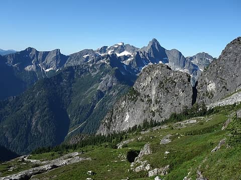 Day 2 - We awoke to damp conditions and still an overcast sky. We didn't waste time getting started though because we both knew this was going to be the longest and most difficult day as we had to gain roughly 4,800 feet with our packs to Luna Col, which would be our worse case scenario plan. Best case scenario we would continue and summit Luna the same evening. We continued up the Big Beaver Trail a mile beyond Luna Camp, and decided to turn left and leave the trail wherever it looked decent. I had read many reports of a trail heading up access creek, but we never found it. The adventure began with a 10 minute bushwhack to Big Beaver Creek, which we removed our shoes and waded across fairly easily. The water was only up to my knees or so and once across, we were already soaked! From here we endured some of the worst bushwhacking and gained 500 feet through dense trees and bushes, crossing to the north side of Access Creek just below a waterfall. Once we passed 3,000 feet in elevation, the angle of ascent, and the intensity of bushwhacking decreased and we continued walking up the valley along the north side of the creek. At times we could see what looked like game trails but nothing resembling a man made boot path. It took us around 2.5 hours to gain the next 1,000 feet elevation to the small meadow where people have camped in the past at 4,000 feet. We were forced around areas of devils club, and through some slide alder until we reached talus. Going solely off Stephs Pickets map with various traverse routes drawn in, we turned sharply south and began ascending steep talus towards the broad 5,540 saddle in the long ridge extending SE off of Luna Peak. We would later find out this route was incorrect but at the time we went for it. At about 4,400 feet, we entered into a narrow gully with what looked like two possible routes. The left side looked like it topped out in a cliff so we continued up the right side, up Class 3, then Class 4 climbing up a narrowing gully. At one point I had to climb up onto some roots and dirt above a wet, slippery slab with incredible exposure below us down the gully. Once atop the slabs, I was unable to see if this also indeed cliffed out, so I made a committing move over a small rib and continued climbing up moss covered wet Class 3-4 rock until I saw the 40 foot cliff at the very top. I could easily see that above this cliff the terrain leveled out considerably, and I questioned whether we were on route. I spotted a series of huge flakes I could climb up on lead but realized I would not be able to carry my pack through the barrage of trees at the top so we roped up and I led a short 30 meter pitch of low 5th class sh## through dirty, mossy flakes and tons of trees. I was ale to make an anchor but would not be able to haul the packs up. Etai would then try to climb the pitch with both packs on TR. He managed to get past the flakes very well with both packs (one dangling below him) but wasn't able to haul them through the trees, and I was forced to rappel down from a tree and grab them. I was able to take them both, and place them safely on a rock and put him back on belay to finish climbing through the trees. All in all, this single pitch of sh## climbing took 1.5 hours, and Etai wasted lots of energy trying to get both packs up. Once we managed to extract ourselves, the bush began thinning considerably, and we continued ascending up grassy/talus slopes stopping for water whenever we ran into a small stream. Eventually we reached the broad saddle where our first, up close views of the southern Pickets greeted us. By now the clouds had parted and the sun was out. A nice long rest was in order as we took in the rugged north faces of the southern Pickets. Elephant Butte and Mount Prophet were also easily visible, as well as Luna Peak just to our right.