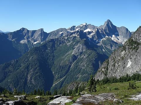 First, before I go too much into describing this amazing trip, let me first give an overview about what we (Etai and myself) did. Day 1 - Have my mom drop us off at the Ross Lake Resort Trailhead along Highway 20. Shuttle up Ross Lake to Big Beaver Trail and camp at Luna Camp. This would be the last time we see people for a week. Day 2 - Bushwhack up Access Creek, ascend south to the ridge extending SE off of Luna Peak and camp 150 feet below Luna Col. Day 3 - Ascend the standard south ridge of Luna Peak, then traverse SW, then west towards the east peak of Mount Fury. Ascend directly up the east ridge of East Fury over point 7,860 (one 5th class spot), and traverse over the flat upper part of the Fury Glacier to the south ridge which we then finished the ascent to the summit of East Fury and camped on a large flat rock. Day 4 - Traverse to West Fury and back without packs (low 5th class), then descend the south ridge of East Fury to where the Fury Glacier Steepens. Since we didn't bring boots or crampons, we were forced to climb up a small tower on the rugged ridge connecting to Outrigger Peak (solo low 5th on horrible rock from a tiny notch). Make two rappels down the face to where the glacier mellows and traverse to the low notch between Outrigger and East Fury. Ascend the NW face of Outrigger via talus/ledges and descend the ridge and camp around 7,100 feet, just above Picket Pass. Day 5 - Rest Day. Finish descent to Picket Pass and over Point 6,900 and up to Frenzel Camp. Day 6 - Descend from Frenzel Camp onto snow and traverse to the North Buttress of Mount Terror. Climb North Buttress and summit Terror and descend the standard West Ridge/South Gully. Camp at Crescent Creek Camp. Day 7 - Traverse to Chopping Block Ridge Camp and descend the Crescent Creek approach to Goodell Creek (utterly horrible bushwhacing!!). Hike out to Highway 20 on good trail along Goodell Creek. Hitchhike back to the Seattle Area. This was a real Pickets adventure for the ages and one I will never forget! Now, here's the detailed version. Day 1 The planning for this trip began in March when Etai, (who was taking a trip to the US from Israel), contacted me via SummitPost asking for someone to traverse the Pickets with. This is something I had been wanting to do for a long time so I agreed to join and we talked about ideas for a full traverse for a number of months as I was in both Alaska and Peru. We agreed on dates which would be the second week of August, right after I returned from Peru. We finally agreed to somehow get a ride to Ross Lake and take the shuttle up to Big Beaver and enter the Pickets via Access Creek to Luna Col. So when the day came, I convinced my mom to take us up, and we simply planned to hitchhike out at the end of the trip. So in the morning of Tuesday, August 9th, we went to Seattle to pick up Etai, who had just flown to Seattle the evening before from Miami, and we quickly looked over what he was bringing. I knew we would need to go ultra light for this trip to be a success, so the day before I went shopping and bought a new Big Agnes ultra light tent, a new 7.5mm 60 meter rope, and a new pair of microspikes, which we would bring rather than crampons. Unfortunately we didn't take a close enough look at all his gear and he would spend the entire trip carrying roughly 5 pounds extra weight. We drove to the Ross Lake Resort trailhead where my mom dropped us off (after a nice stop at Panara Bread for a good lunch), and hiked down to the dock where we were picked up. The boat ride was quick...maybe just 20 minutes and cost $60. We told the boat driver we didn't need a pick-up and began up the Big Beaver Trail. We were committed at this point unless we wanted to hike like 7 miles along the lake back to highway 20! The hike up the trail was uneventful and with overcast skies, the dense forest looked eerie. Etai was enjoying the Pacific Northwest forests as we made our way up the 8 miles to Luna Camp. Both the blue and red huckleberries were in full force and I didn't go more than 15 minutes without stopping to taste their sweet goodness and to get a few extra calories since I knew I wasn't carrying enough food for a trip of this size. We made camp around 5pm and had a group of 4 backpackers next to us. We briefly visited with them and I made my typical mac and cheese for dinner, while Etai had one of his 6 Mountain House freeze dried meals. That first night it rained a bit but I wasn't worried because the forecast the entire week called for excellent weather (other than the first night). Unfortunately I realized that any bushwhacking we would have to do would get us very wet!